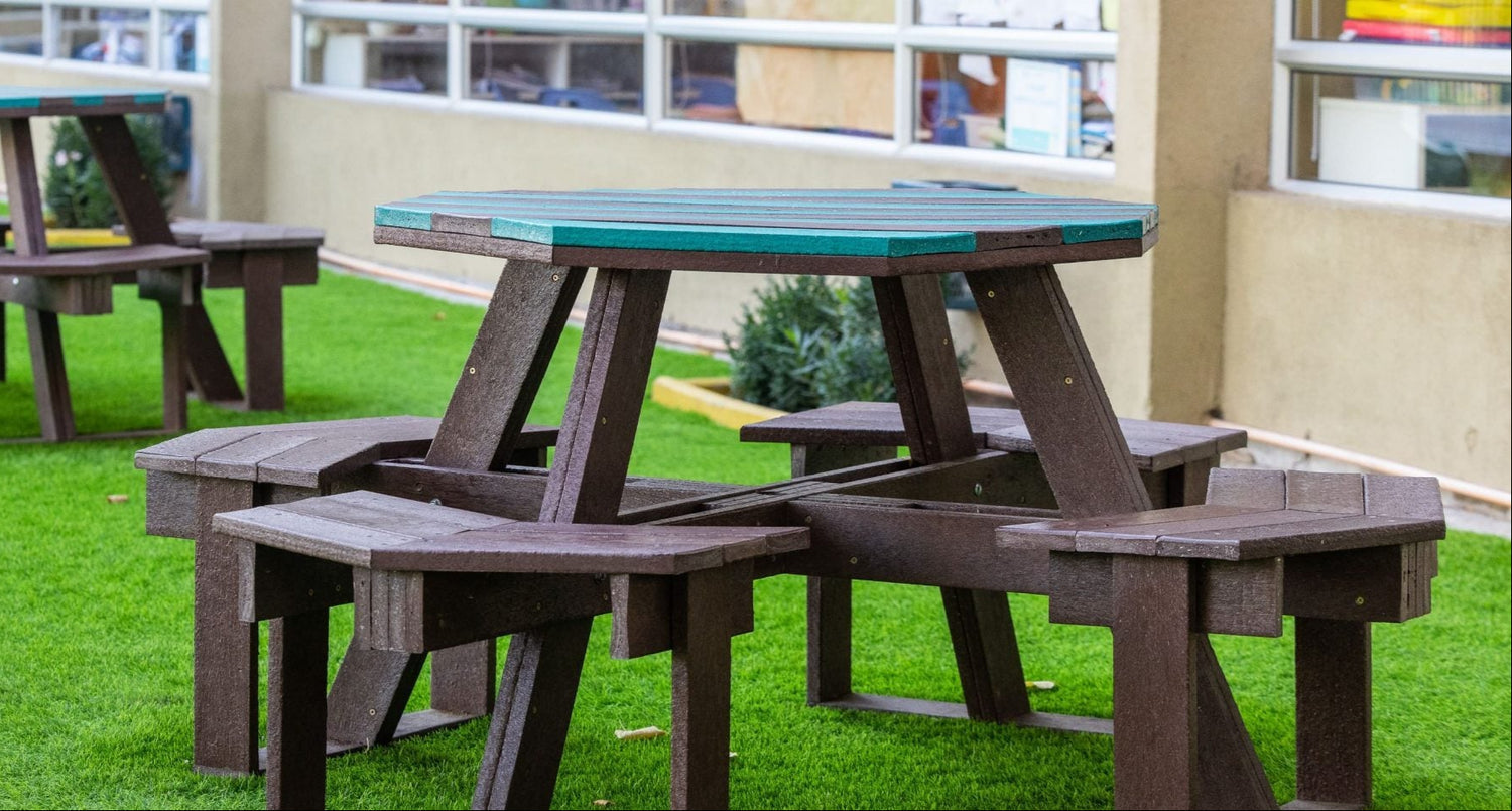 Todo nuestro mobiliario y equipamiento de exterior es fabricado con plástico 100% reciclado provenientes de cooperativas y recicladores
